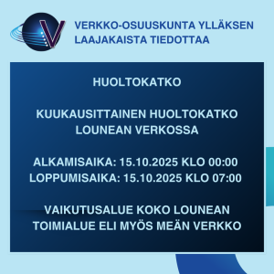 Lounean verkossa toteutetaan 15.10.2025 klo 00:00 – 07:00 ennalta suunniteltu kuukausittainen huoltokatko. Pahoittelemme huoltotöistä mahdollisesti aiheuttavaa haittaa.